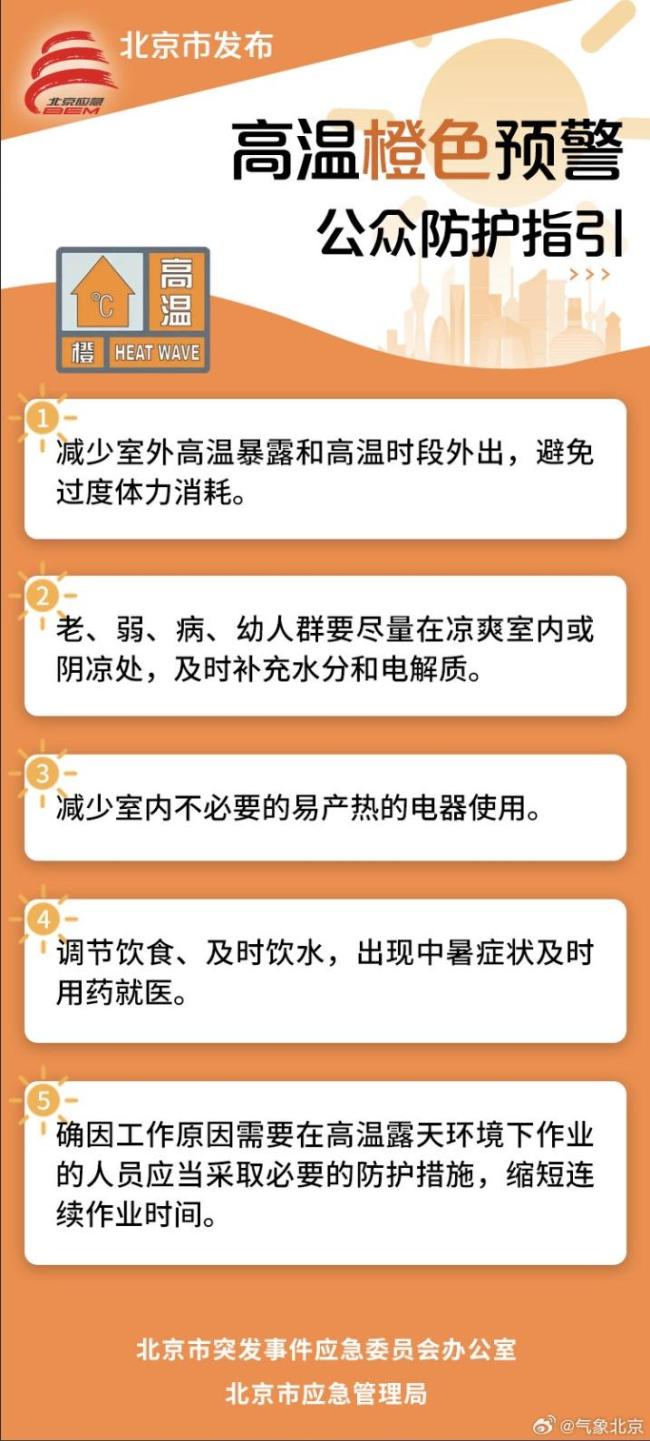 今天北京晴朗持续,最高气温将达37℃,成为今年首个高温日。明后天依旧暖热,公众需注意防暑防晒。受暖气团控制,北京市气象台已于4日18时发布高温橙色预警信号。