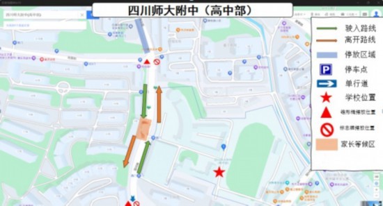 成都十二中高中部校区考点位于太平南新街68号。考试期间,太平南新街-共和村路-红瓦寺街实施单向通行,相关路口将设置交通诱导提示牌,并根据现场情况进行交通管控。6月7日至9日,在太平南新街、共和路等地设置考生家长临时停车点,允许单向单排停放,但十二中门前50米范围内禁止停车。共享单车及其他非机动车停放在50米范围外。
