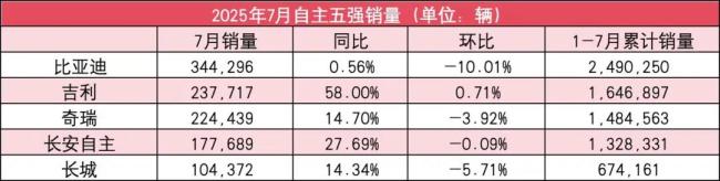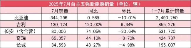 自主5强7月销量:比亚迪增速放缓,吉利新能源暴涨120%