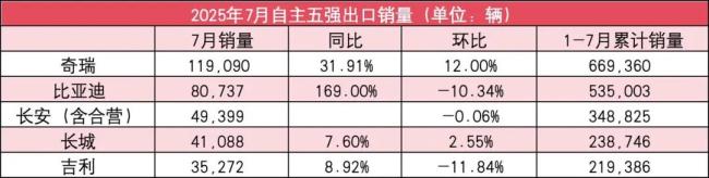 而在海外市场方面,奇瑞依旧位列第一。7月份,奇瑞出口量为119,090辆,同比增长31.9%,环比增长12%,占当月销量53%;1-7月份,奇瑞累计出口汽车669,360辆。而开启疯狂海外市场扩张的比亚迪,7月海外销量80,178辆,环比下降10.34%;今年1-7月,比亚迪累计销量为535003辆。虽然比亚迪进攻非常猛,但奇瑞深耕海外市场已20余年,比亚迪想要挑战奇瑞“出口一哥”绝非朝夕之间就完成的。