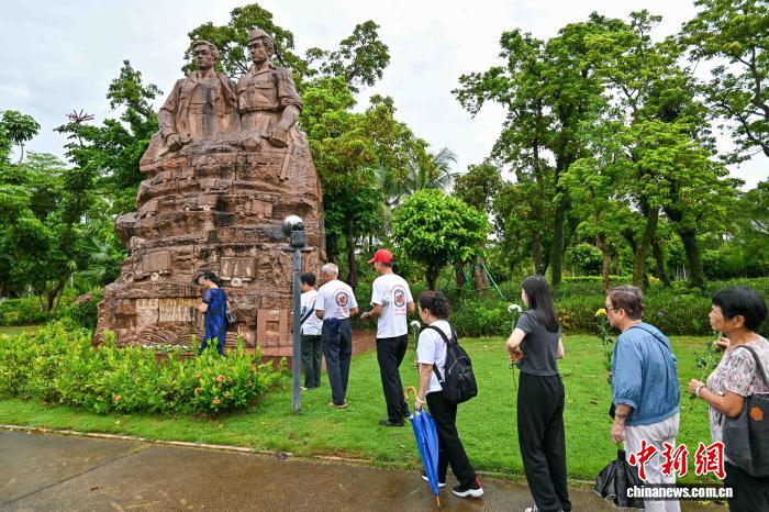 8月25日,海南海口,参加2025海外华文媒体海南采访行活动的海外华媒代表,与南侨机工、琼崖华侨回乡服务团后人等,向《南洋华侨机工回国服务团》《琼崖华侨回乡服务团》两座雕塑默哀、献花,追忆华侨回国支持抗战。中新社记者 骆云飞 摄