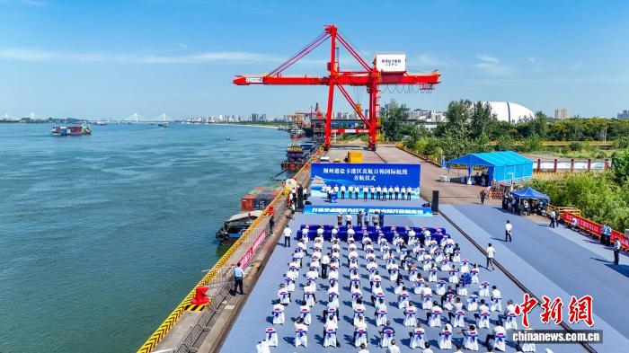 图为荆州港盐卡港区直航日韩国际航线首航。(无人机图片)张梦瑶 摄