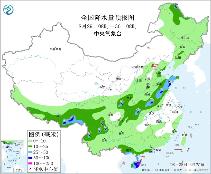全国降水量预报图(8月28日08时-29日08时)