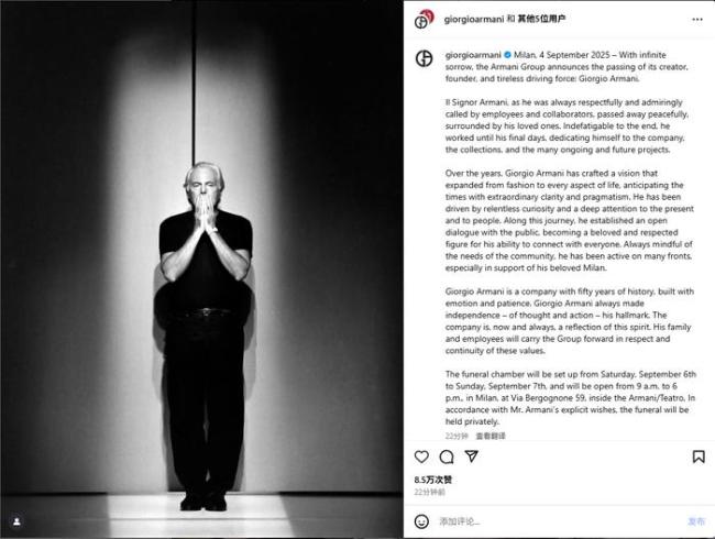 意大利时装设计师乔治·阿玛尼于9月4日离世,享年91岁。阿玛尼公司宣布了这一消息,表达了对这位缔造者、创始人及不懈推动者的深切哀悼。