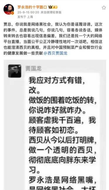 事件在9月14日晚再度升级,西贝创始人贾国龙在某个行业群内的表态完整版截图流出,除表示要“打明牌”、向胖东来学习外,贾国龙还在发言中将罗永浩称为“网络黑嘴”和“网络黑社会”,这才引发了罗永浩要追究法律责任的要求。