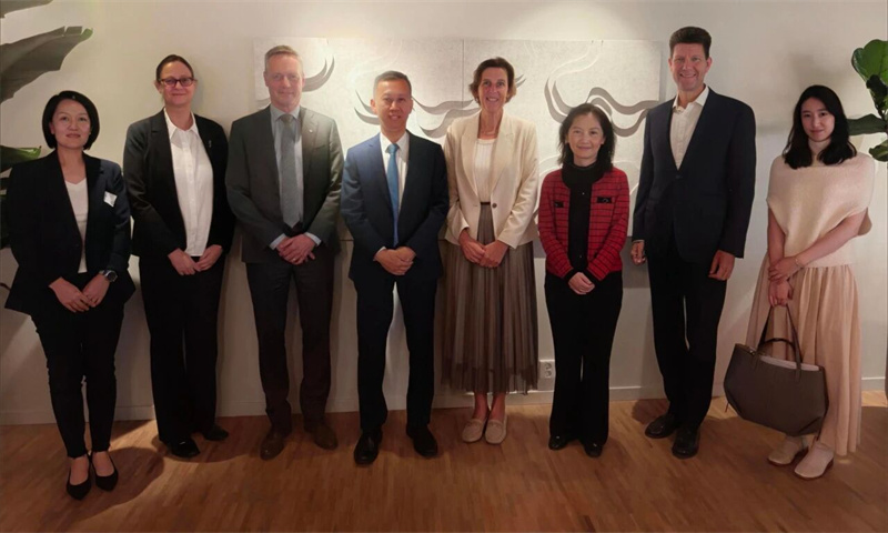 中国驻瑞典大使崔爱民(左四)一行走访瑞典山特维克集团。中国驻瑞典大使馆供图