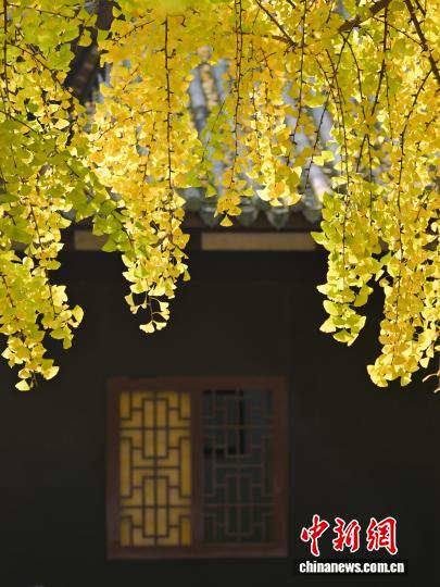 11月24日,初冬暖阳下,四川省眉山市东坡区纱縠行南街的三苏祠博物馆南门内,高大的银杏树渐染金黄,金黄叶片随风轻舞,吸引不少游客驻足观赏、拍照留念,现场洋溢着浓浓的诗意与雅致氛围。图为三苏祠内金黄的银杏叶。中新社记者 刘忠俊 摄
