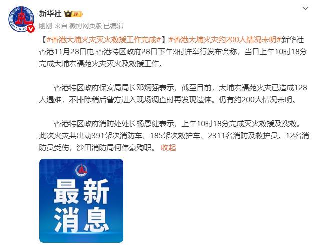香港特区政府28日下午3时许举行发布会,宣布当日上午10时18分完成大埔宏福苑火灾灭火及救援工作。保安局局长邓炳强表示,火灾已造成128人遇难,仍有约200人情况未明,不排除稍后警方进入现场调查时再发现遗体。