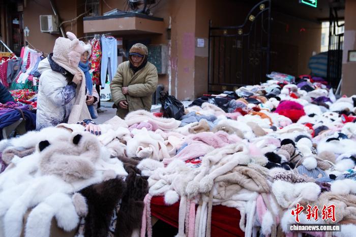 12月2日,黑龙江哈尔滨,游人选购保暖物品。当日,黑龙江哈尔滨最高气温今冬首次降到-10℃以下 ,在哈尔滨红专街早市,棉帽子、大花袄等保暖物品摆上街头,游人纷纷选购。中新社记者 赵宇航 摄