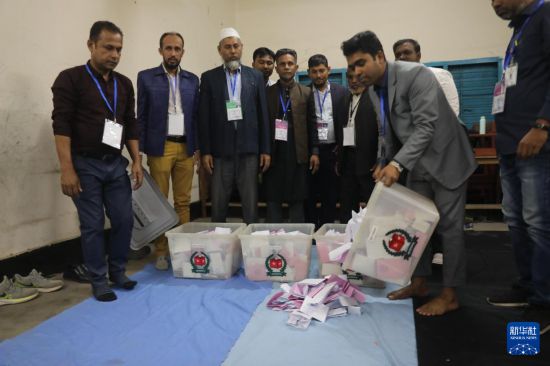 2月12日,在孟加拉国首都达卡,选举工作人员在投票站计票。新华社发(哈比卜·拉赫曼摄)