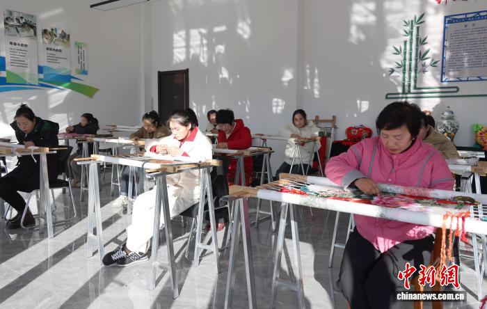 图为庆阳群英香包有限公司,左焕茸(右一)和绣娘赶制刺绣作品。盘小美 摄