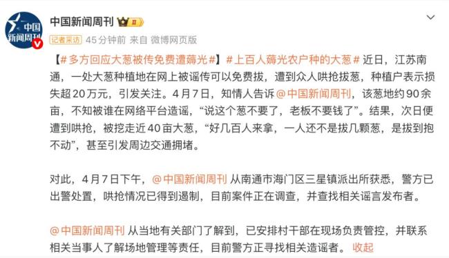 大葱被传免费拔 种植户损失超20万 谣言引发哄抢潮