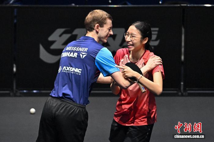 4月9日,2026年世界乒乓球职业大联盟(WTT)常规挑战赛太原站正赛在太原市滨河体育中心体育馆开赛,来自19个国家和地区的近百名选手向400点世界排名积分发起挑战。图为跨国组合塞德里克·迈斯纳(德国)/李凯敏(中国香港)在比赛获胜后拥抱庆祝。中新社记者 韦亮 摄