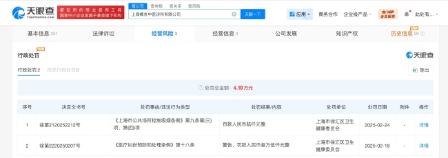 根据天眼查App的信息,这家公司成立于2024年1月,法定代表人是龙林海,注册资本为100万人民币,主要提供中医诊所服务。股东信息显示,该公司由龙林海全资持有。今年3月,由于无法通过登记的住所或经营场所联系到该公司,上海市徐汇区市场监督管理局将其列入经营异常名录。此外,2025年2月,该公司因违反《上海市公共场所控制吸烟条例》和《医疗纠纷预防和处理条例》而受到处罚。