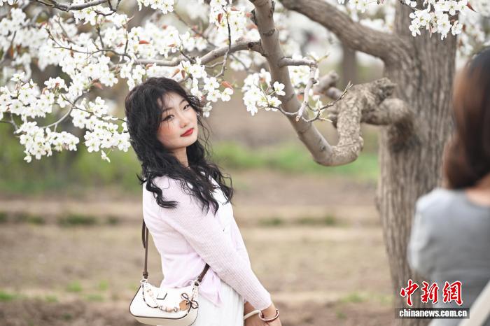 4月12日,位于甘肃省兰州市皋兰县什川古镇的万亩百年古梨园花开吸引游人踏青拍照。中新社记者 李亚龙 摄