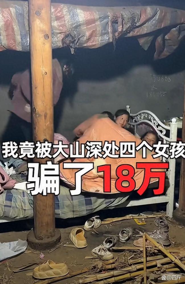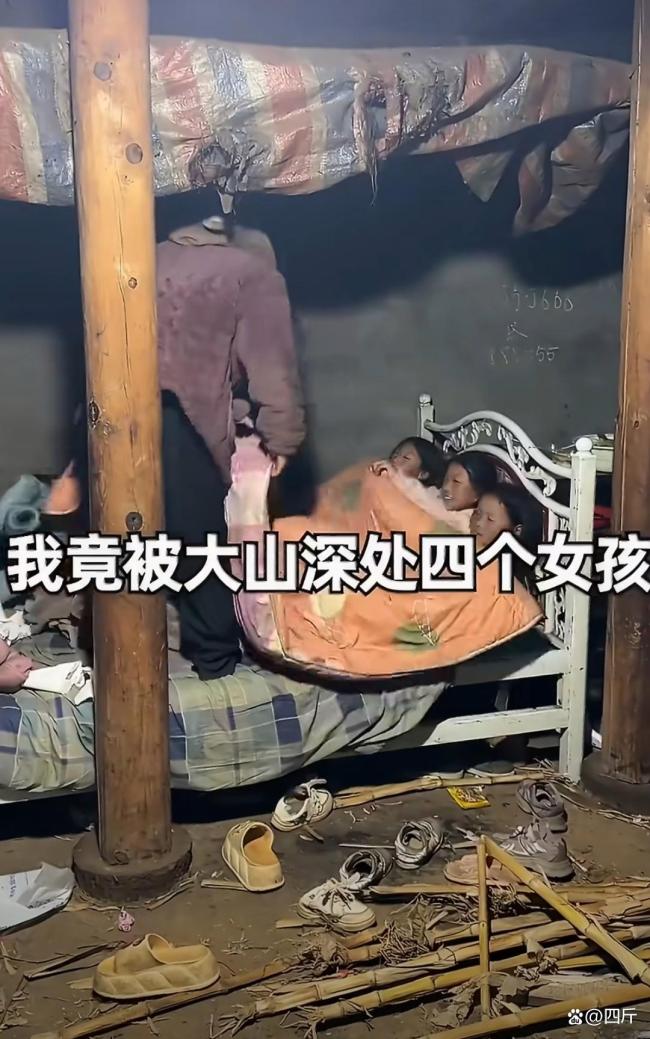 黑漆漆的破旧木屋,屋顶是烂得千疮百孔的彩条布,风一吹就哗哗作响,下雨天更是直接往屋里灌雨;四个小姑娘挤在一张摇摇晃晃的旧铁床上,盖着薄得可怜的被子,连个像样的床垫都没有,二妹还曾经从破床上直接摔下来过;泥土地面上全是碎瓦片、干竹枝,几双破破烂烂的鞋子扔在地上,大冷的天连双合脚的棉鞋都穿不整齐;姐妹几个就围着一个小小的火塘取暖,连件厚外套都穿不整齐,怯生生的样子看得人鼻子发酸。博主问起家里的情况,大姐阿吉就红着眼圈、低着头说,爸爸不在了,妈妈出去打工就再也没回来过,姐妹四个无依无靠相依为命,连饭都吃不饱,学都快上不起了。