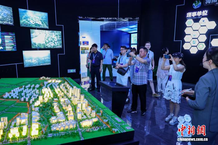 4月16日,参加“开局之年看中国·开放自贸港”网络主题传播活动的海内外媒体人,在三亚崖州湾科技城高新区展厅了解园区产业空间规划。中新网记者 骆云飞 摄
