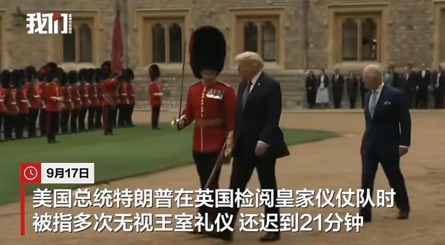 9月17日,美国总统特朗普在英国检阅皇家仪仗队时被指多次无视王室礼仪,并且迟到了21分钟。英国国王查尔斯三世举行欢迎仪式期间,特朗普两次拍打查尔斯三世的背。在检阅仪仗队时,特朗普大步走在前面与卫兵交谈,把查尔斯三世甩在后面