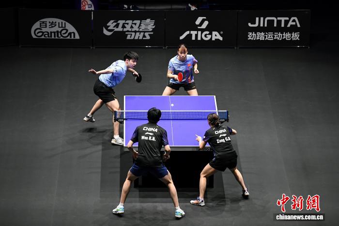4月9日,2026年世界乒乓球职业大联盟(WTT)常规挑战赛太原站正赛在太原市滨河体育中心体育馆开赛,来自19个国家和地区的近百名选手向400点世界排名积分发起挑战。图为中国选手黄友政(左上)/石洵瑶(右上)对阵温瑞博(左