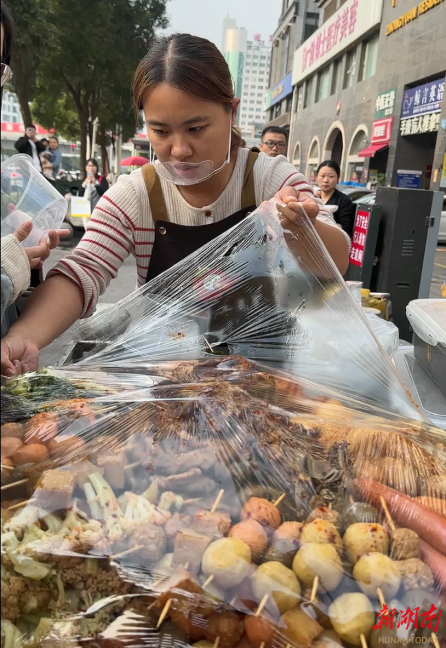10月15日下午,长沙涂家冲地铁站附近,黎明和文雅夫妇的辣卤摊被慕名而来的食客层层包围。人群中不时传来询问:“哪款是‘小孩姐’最爱吃的?”答案直指那浸满汤汁、售价3元一片的招牌兰花干子