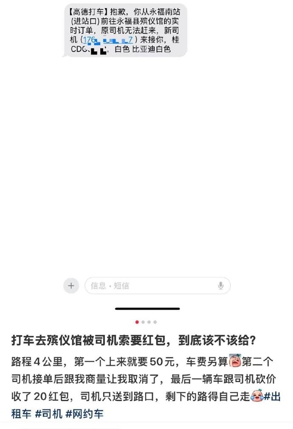 近日,广西桂林,一名网友发帖称,自己在打车前往殡仪馆途中,被多个网约车司机索要红包。该网友描述,11月8日他打车前往殡仪馆,全程约4公里。第一次叫车后,司机以目的地是殡仪馆为由,要求支付50元红包当作“利是”,车费另算。取消订单后,第二次叫...