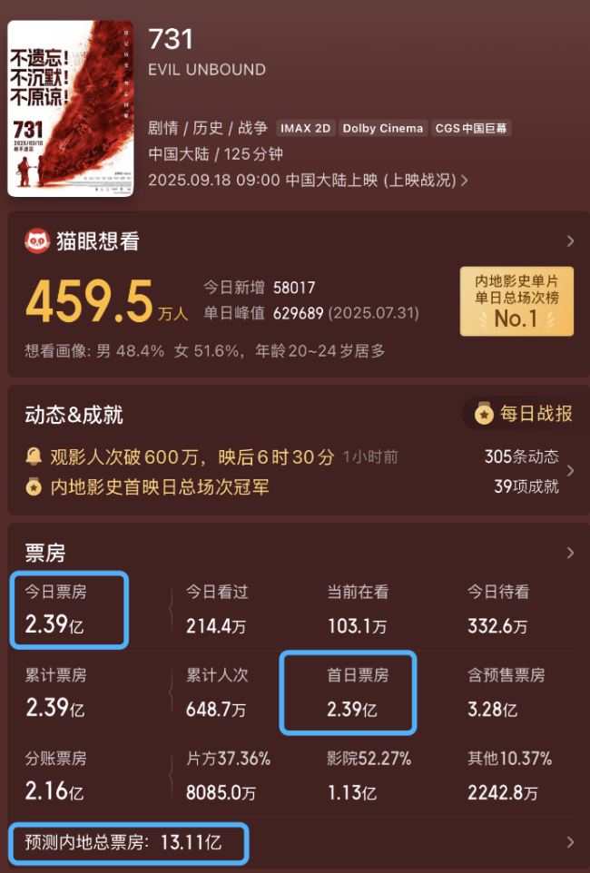 首日票房破2亿,超600万人次观影,电影《731》是否有望延续《南京照相馆》的热度,成为抗战题材领域下一个现象级作品?