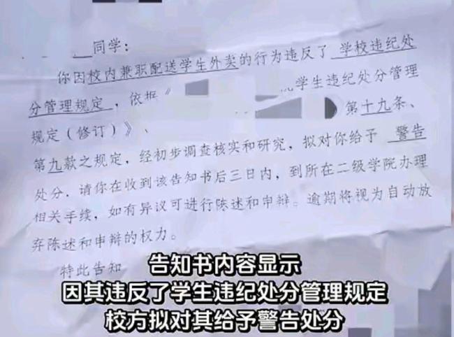 重庆一名大一学生因在校内兼职送外卖,收到了学校的“违纪处分告知书”,拟给予警告处分。好在校方最终中止了处分流程,未对该学生作出实际处罚。这起事件引发热议的核心是家庭困难学生靠劳动自立是否应该被禁止