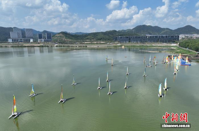 9月27日,众多帆船启航。当日,2025中国家庭帆船赛·杭州站在浙江杭州临安青山湖拉开帷幕,来自北京、上海、武汉等10个城市的40组家庭近百名选手在绿水青山间扬帆。(无人机照片)中新社记者 王刚 摄