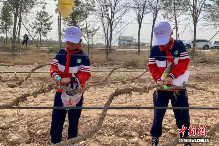 中新网银川4月15日电 (李佩珊 李晓歌)春风拂过贺兰山东麓,万亩葡萄园渐焕生机。4月15日,一场别开生面的酿酒葡萄展藤研学实践活动在宁夏戈兰酒庄葡萄种植基地热闹开启。来自银川市西夏区华西希望小学的100余名学生走