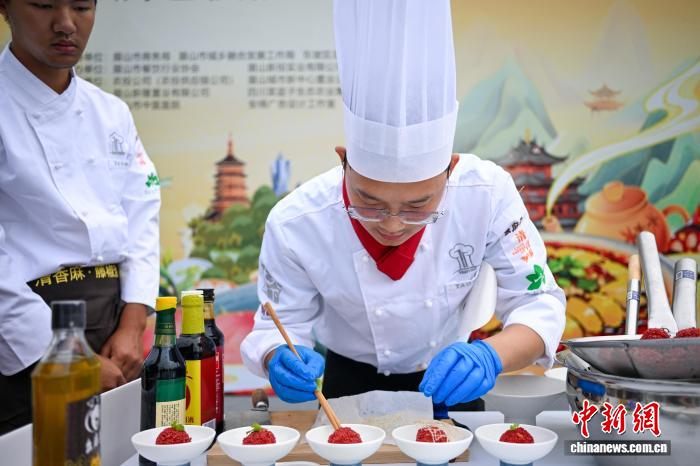 9月27日,一场精彩的厨艺技能大赛在四川眉山市东坡区太和公园星光湾举行。专业与业余选手同台竞技,为现场民众及游客呈现了一场兼具视觉与味觉的美食品鉴盛宴。图为参赛厨师正在紧张制作菜品“荔枝虾球”。中新社记