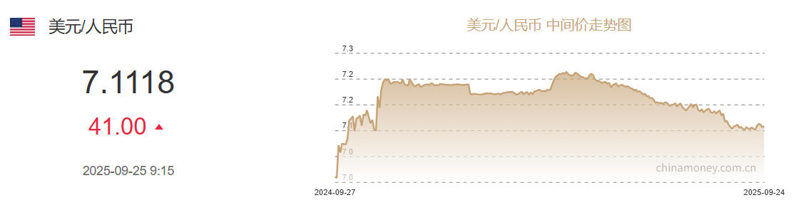 9月25日人民币对美元中间价报7.1118元 下调41个基点