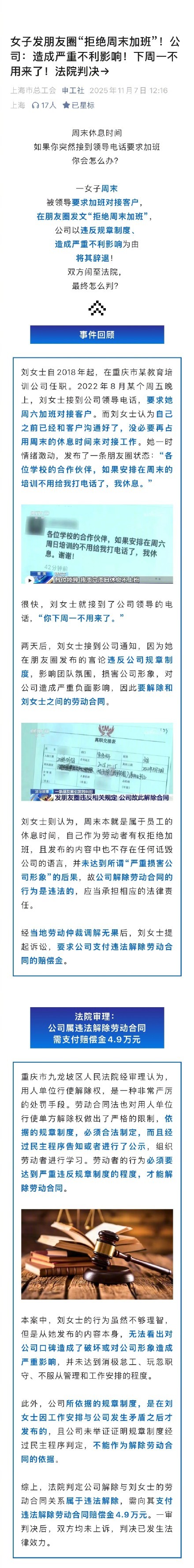 一名女子因拒绝周末加班,在朋友圈发文表达不满后被公司辞退。双方最终闹至法院,事情有了结果。刘女士自2018年起在重庆市某教育培训公司工作。2022年8月的一个周五晚上,她接到领导电话要求周六加班对接客户