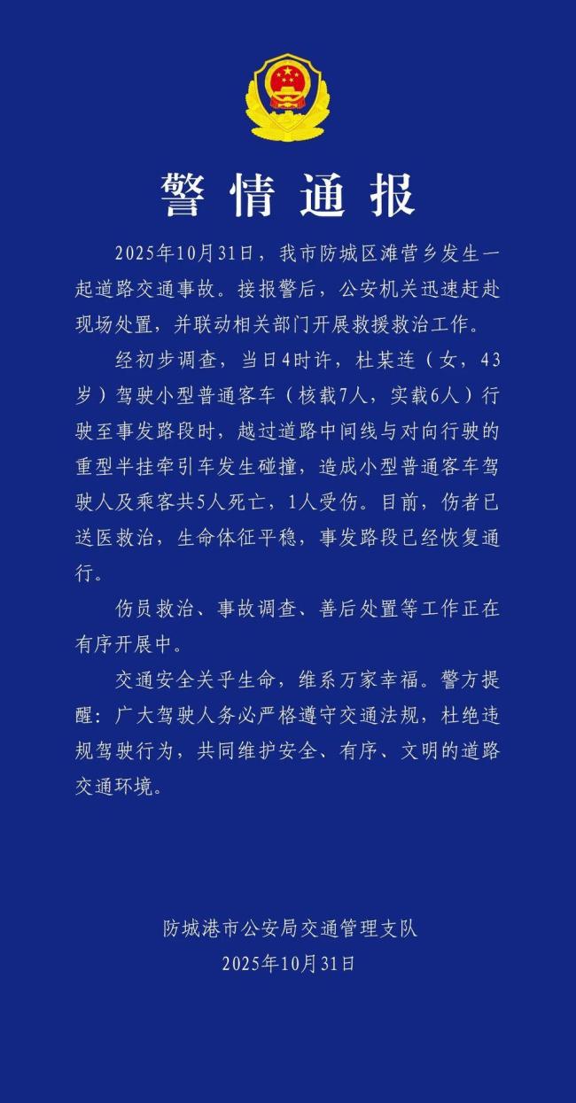 10月31日中午,防城港交警通报了一起道路交通事故。事故发生在防城区滩营乡。当日4时许,杜某连(女,43岁)驾驶一辆小型普通客车(核载7人,实载6人)行驶至事发路段时,越过道路中间线与对向行驶的重型半挂牵引车发生碰撞