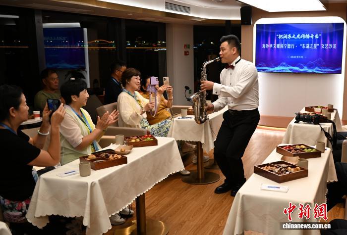 9月13日晚,“把闽东之光传播开去”——海外华文媒体宁德行活动在福建省宁德市启动,此次活动共有12国16家海外华文媒体代表前来参访。图为“东湖之星”文艺沙龙现场,海外华文媒体代表体验“零碳文旅”、共赏文艺沙