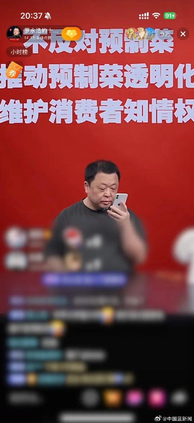 9月12日晚,罗永浩在社交媒体上直播讨论了西贝事件。背景大屏上写着“不反对预制菜 推动预制菜透明化 维护消费者知情权”。罗永浩表示,目前预制菜还没有正式的国家标准,他并不反对预制菜本身,而是反对将预制菜伪装成现做的菜品销售
